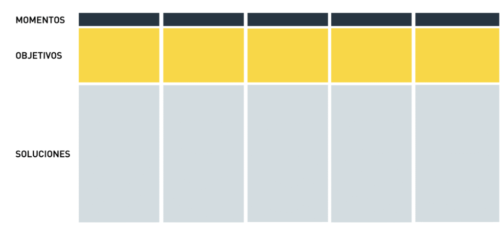 Matriz MOS (Momentos, Objetivos, Soluciones): No intentamos mejorar todo a la vez. Primero, identificamos los Momentos que son más críticos (a nivel general) en el viaje del cliente. Para cada momento, establecemos Objetivos claros – ¿qué es lo que queremos que suceda en cada momento?. Y finalmente, proponemos para luego priorizar y diseñar las Soluciones para alcanzar dichos objetivos, esto es, el medio – ¿cómo lo vamos a lograr?.