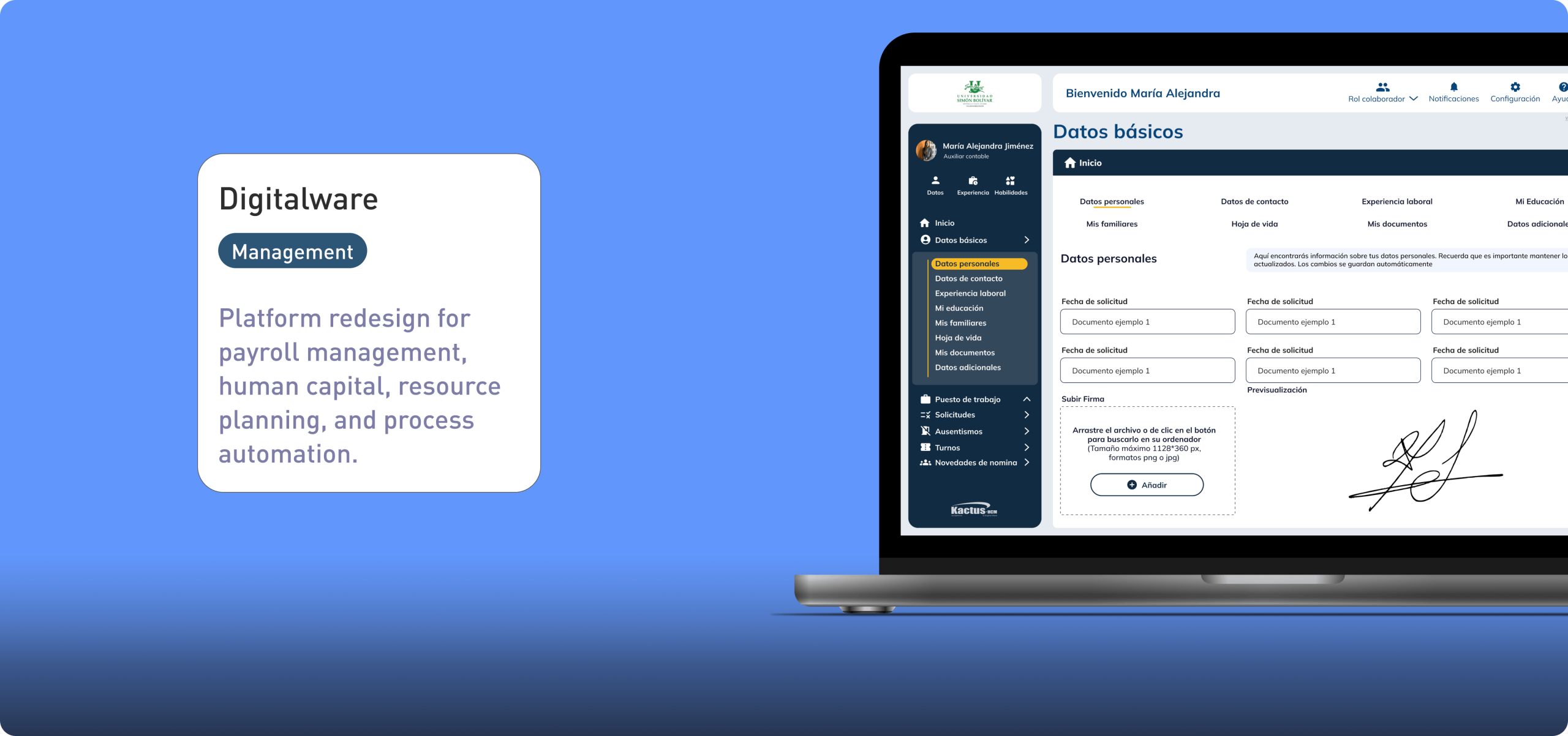 Digitalware es una de las empresas de software (SaaS) más grandes de Colombia. Se especializan en proporcionar soluciones para la gestión del talento humano. Para lograr esto, cuentan con un amplio portafolio de soluciones respaldadas en diversas plataformas como iOS, Android y PWAs. Una vez más, el cliente requirió que el equipo de diseño tuviera experiencia en diseñar para múltiples plataformas.