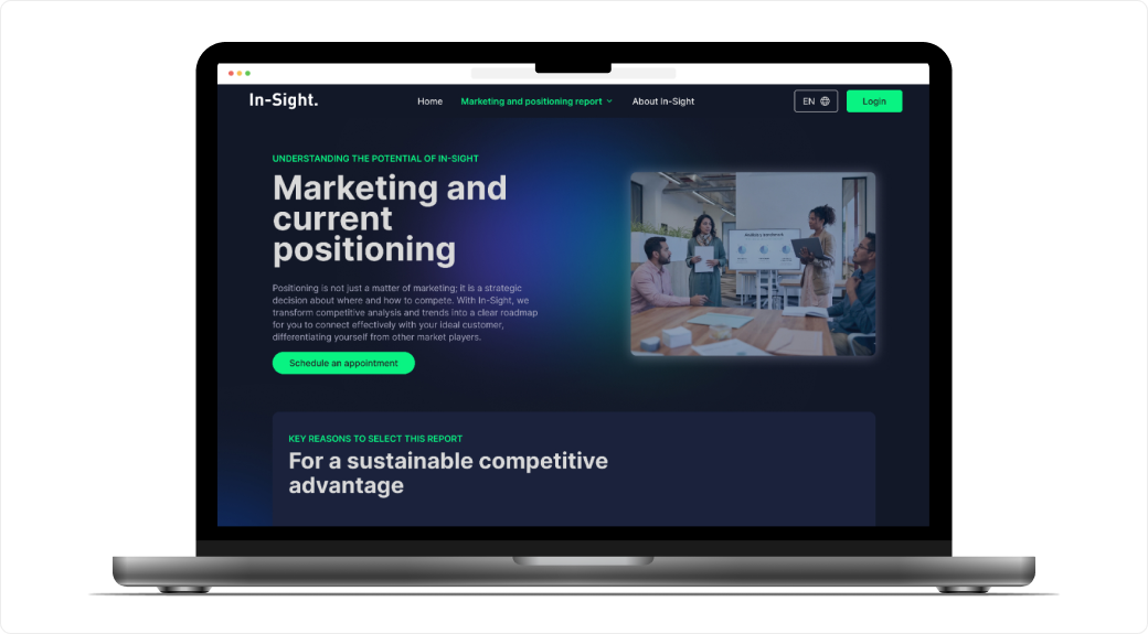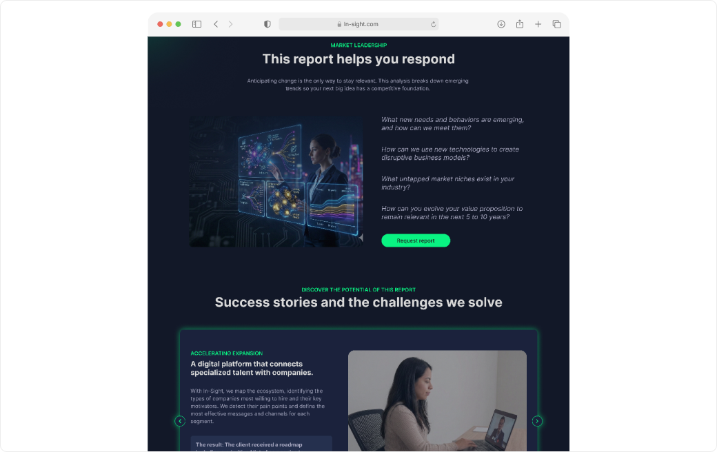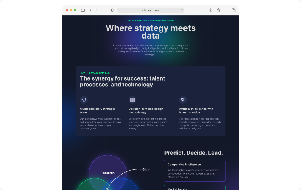 Insight es un agente de IA diseñado para optimizar los procesos de investigación secundaria. El equipo de In-Sight necesitaba construir un sitio web fácil de usar que ayudara a lograr mejores conversiones de clientes.